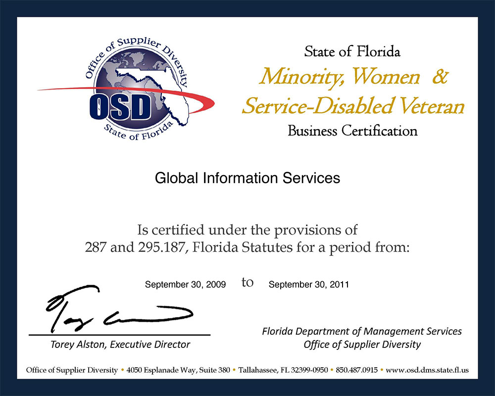 Global Information Services, Inc. is a minority owned and certified corporation in the state of Florida.